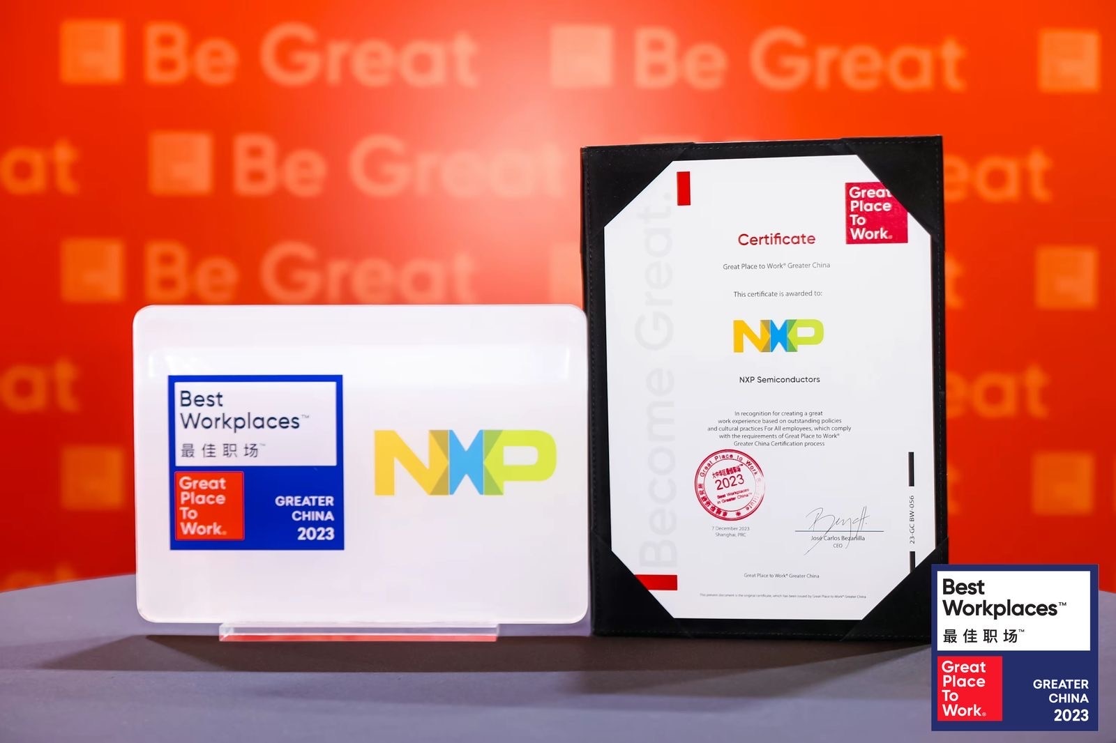 恩智浦荣获“2023年大中华区最佳职场榜单”奖杯与证书