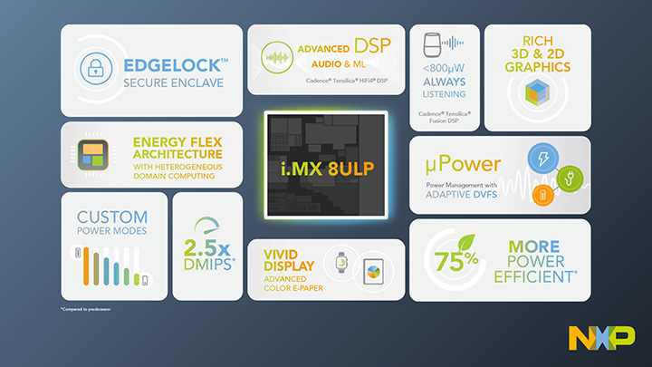 在i.MX 8ULP和i.MX 8ULP-CS系列中,Energy Flex架构将异构域处理、设计技巧和28nm FD-SOI工艺技术相结合,能源效率比前代产品提高了多达75%。这些处理器中嵌入了可编程电源管理子系统,该子系统能够管理20多种不同的电源模式配置,从而提供出色的能源效率——从全功率到低至30微瓦。通过这种灵活的配置范围,OEM和开发人员可以自定义特定应用的电源配置文件,以最大限度提高能源效率。