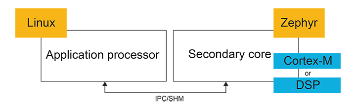 这些异构设计可根据性能、延迟和功耗需求进行工作负载划分。Linux通常运行在Cortex-A核上,而Zephyr实时操作系统运行在Cortex-M核上。Zephyr也可部署在HiFi4 DSP上,执行信号或数据处理任务。