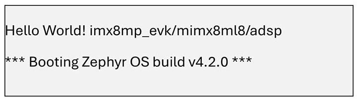 Zephyr hello_world 经典示例展示了如何在HiFi4 DSP上成功启动并运行Zephyr。构建并加载固件后,DSP控制台输出将确认系统已成功启动: