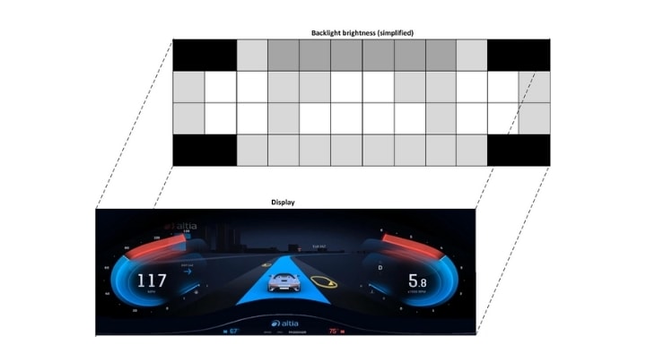 实施局部调光需要将显示屏划分为数百个不同的区域,并根据所显示的内容独立控制每个LED。这需要实时的像素级处理,以补偿亮度变化并避免出现矩形边缘等视觉伪影。而且必须对每一帧画面都进行这样的处理,因此需要大量的计算资源。此外,对于安全关键型汽车显示屏,像素调整必须满足功能安全要求,以确保关键信息始终能被正确呈现。