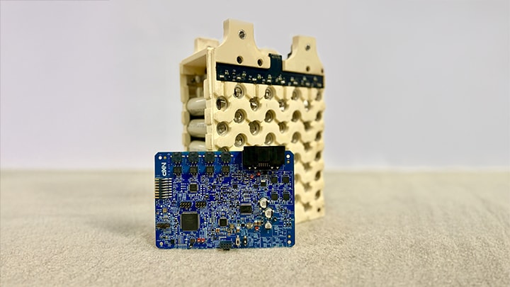 在早期阶段,我们同时进行电池组的机械设计和电气方面的设计,其中包括BMS以及用于关键电池组功能的配套PCB板。为了加速学习进程,我们首先使用ETPL (电气传输协议链路)套件测试了恩智浦800V BMS参考设计。该套件包含一个电池模拟器、一个采用MC33774 (18通道电芯控制器IC)的外设测试板、一个800V电池接线盒(BJB),以及作为主控制器的RD-K358BMU电池管理单元(BMU)。