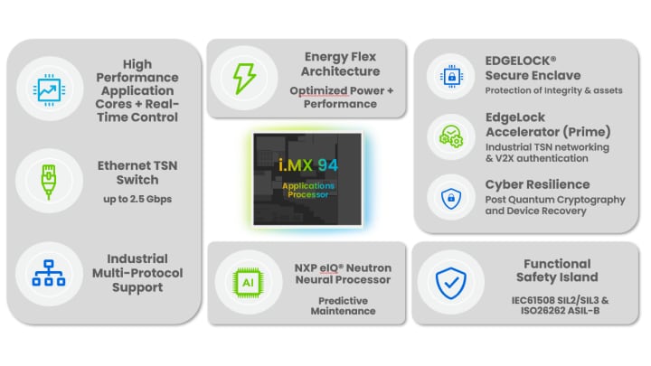 除了处理、网络、功能安全和信息安全功能外,i.MX 94系列还集成了恩智浦eIQ Neutron神经处理单元(NPU),可提供0.5TOPS的AI性能。这使得预测性维护、机器诊断和操作员实时指导等应用成为可能,从而提高了工业系统的效率和可靠性。