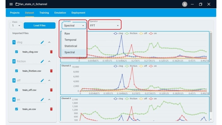 开发人员可以在导入自定义时间序列数据时定义通道和类别的数量。Time Series Studio还提供了多种数据查看选项,包括原始数据、时间数据、统计数据和光谱数据。