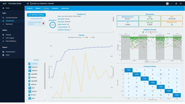 Time Series Studio支持多种传感器输入信号,包括电压、电流、温度、振动、压力、声音和飞行时间等,还支持这些信号的组合,实现多模态传感器融合。其自动机器学习功能使开发人员能够从原始时间序列数据中提取有意义的见解,并快速构建AI模型,以满足微控制器的精度、RAM和存储标准。该工具提供了一个全面的开发环境,包括数据策展、可视化和分析,以及模型的自动生成、优化、模拟和部署。