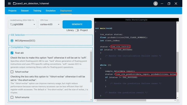 编译所选模型后,可以为应用生成自定义库。使用该库非常简单,只需两次API调用。一次API调用用于初始化模型,另一个用于运行推理。生成的库可兼容MCUXpresso和Code Warrior IDE。