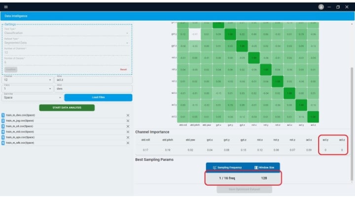 为了应对这些挑战,Data Intelligence提供了一种实用工具,可以评估数据集的平衡性和单个数据通道的重要性。该工具不仅可以检测数据不平衡,还能识别可以删除以优化资源的冗余通道。此外,它还推荐最佳采样频率和窗口大小,使用户能够优化数据集,提高质量并获得更准确的分析结果。