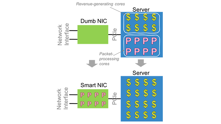 Network interface cards are PCIe cards that plug into a server or storage box to enable connectivity to an Ethernet network. Smart NICS are network interface cards that sport Arm processors or FPGAs to run network and/or low-level storage processing in order to offload the host server processors. The aim is to dedicate the expensive server processors to running revenue-generating customer applications, while offloading the infrastructure-level functions to the less expensive Arm cores on the Smart NIC. Smart NICs can accelerate networking functions like Open vSwitch, security, virtualization and storage.