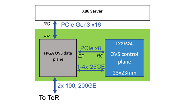 Due to its small package and high processing capabilities, the LX2162A is an excellent choice for a high performance smart NIC. The small sized LX2162A does control plane processing while saving space for an FPGA for data plane.