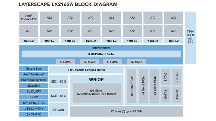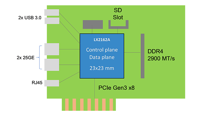 Alternatively, for a low cost single-chip NIC solution, the LX2162A can also be used as a stand-alone processor where it does all the processing on a 2x25GE NIC Card.