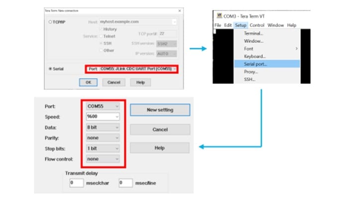 identify your FRDM-RW612 Jlink COM Port number through the “Windows Device manager”. A serial terminal, such as Teraterm is required for the next step. Open a serial terminal (Teraterm) and configure the FRDM-RW612