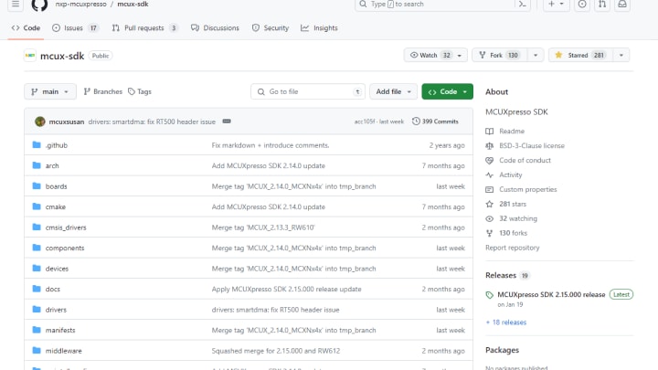 SDK也可以直接从MCUXpresso IDE中或MCUXpresso for VS Code中获取。除了为特定设备生成独立的SDK外,开发人员还可以直接从恩智浦的GitHub库获得相应版本。