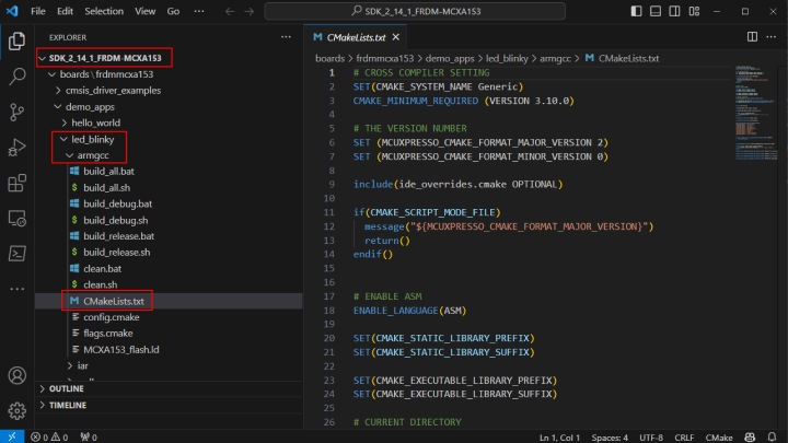 更多的嵌入式项目需要连续集成和连续部署工作流程。基于IDE的项目在微控制器开发中比较常见,但MCX A工具也支持命令行构建,以便在“开箱即用”的CI/CD工作流程中使用。SDK内部有CMake脚本,可以与您喜欢的构建工具(如Make)或快速的Ninja构建系统一起使用。
