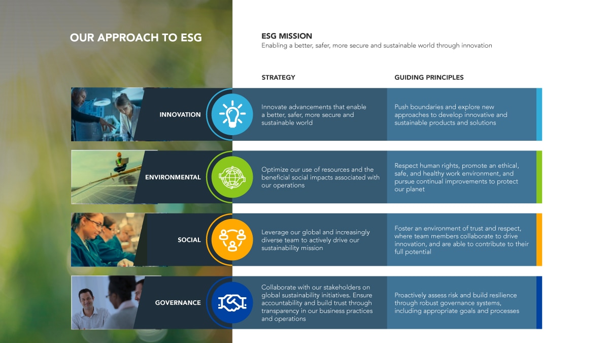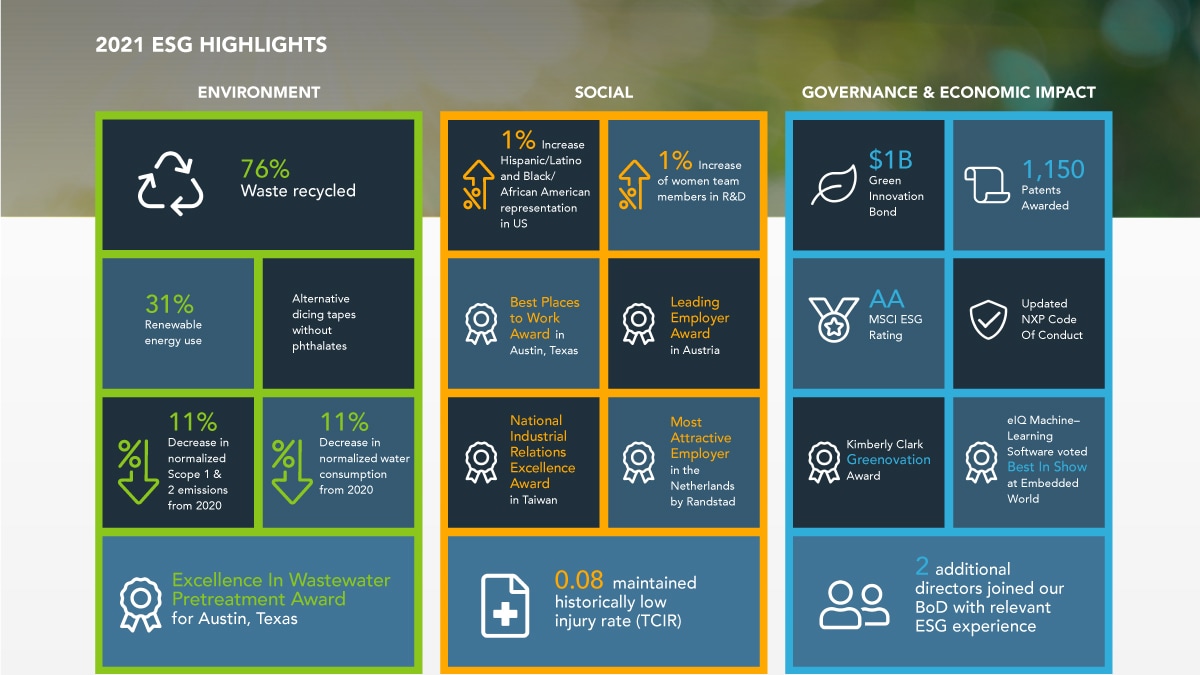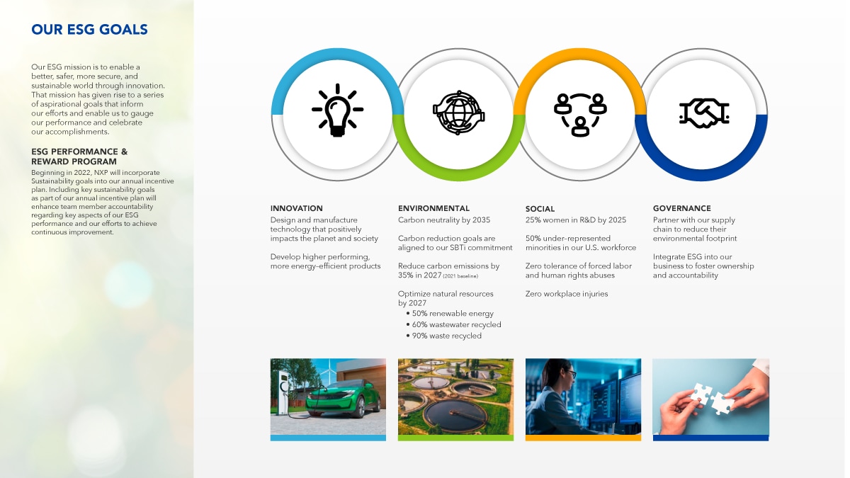 作为一家在半导体行业举足轻重的全球性公司,恩智浦肩负对股东和社会的责任,致力于通过长期可持续发展的方式来管理公司。为此,我们承诺采取一系列环境、社会和公司治理(ESG)行动,推动恩智浦发展,同时打造更加可持续的世界。