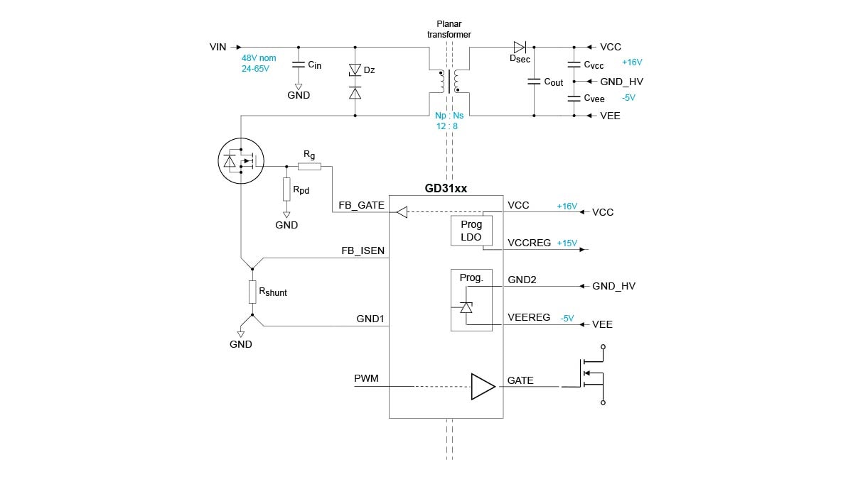 采用SiC或IGBT功率模块的汽车牵引逆变器通常需要双极性栅极驱动器,该驱动器以各功率器件的源极为参考,并与低压控制电路隔离。栅极驱动器由小型隔离转换器供电,通常采用12V-24V的低压电源,并提供1-2W的低功率双极电压,例如+15V或+18V,以及-5V。