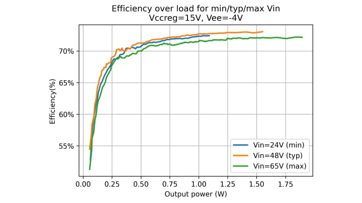 该变压器适用于48V标称输入,支持24V-65V的输入范围(全输出功率),并在1W功率下提供+15V/-4V输出。这使其能够在20kHz下驱动约2µC的栅极电荷。峰值效率高达74%(见图3),在低输出功率条件下,这是一个合理的数值,其中栅极驱动器的静态功耗对整体效率影响较大。