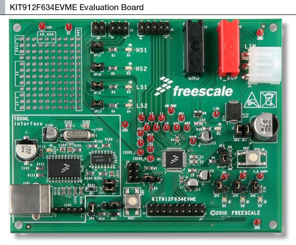 The KIT912F634EVME supports the MM912F634, which is an integrated single package solution that integrates an HCS12 microcontroller with a SMARTMOS® analog control IC (System Basis Chip), interfacing via the new internal high performance Die to Die Interface (D2D). The D2D controlled analog die combines system base chip and application specific functions, including a Local Interconnect Network (LIN) transceiver.