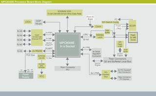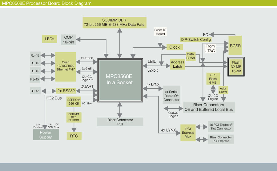 MPC8568E处理器板包括一个运行频率高达1.33 GHz的MPC8568E处理器,同时配备具有以下组件的电路: