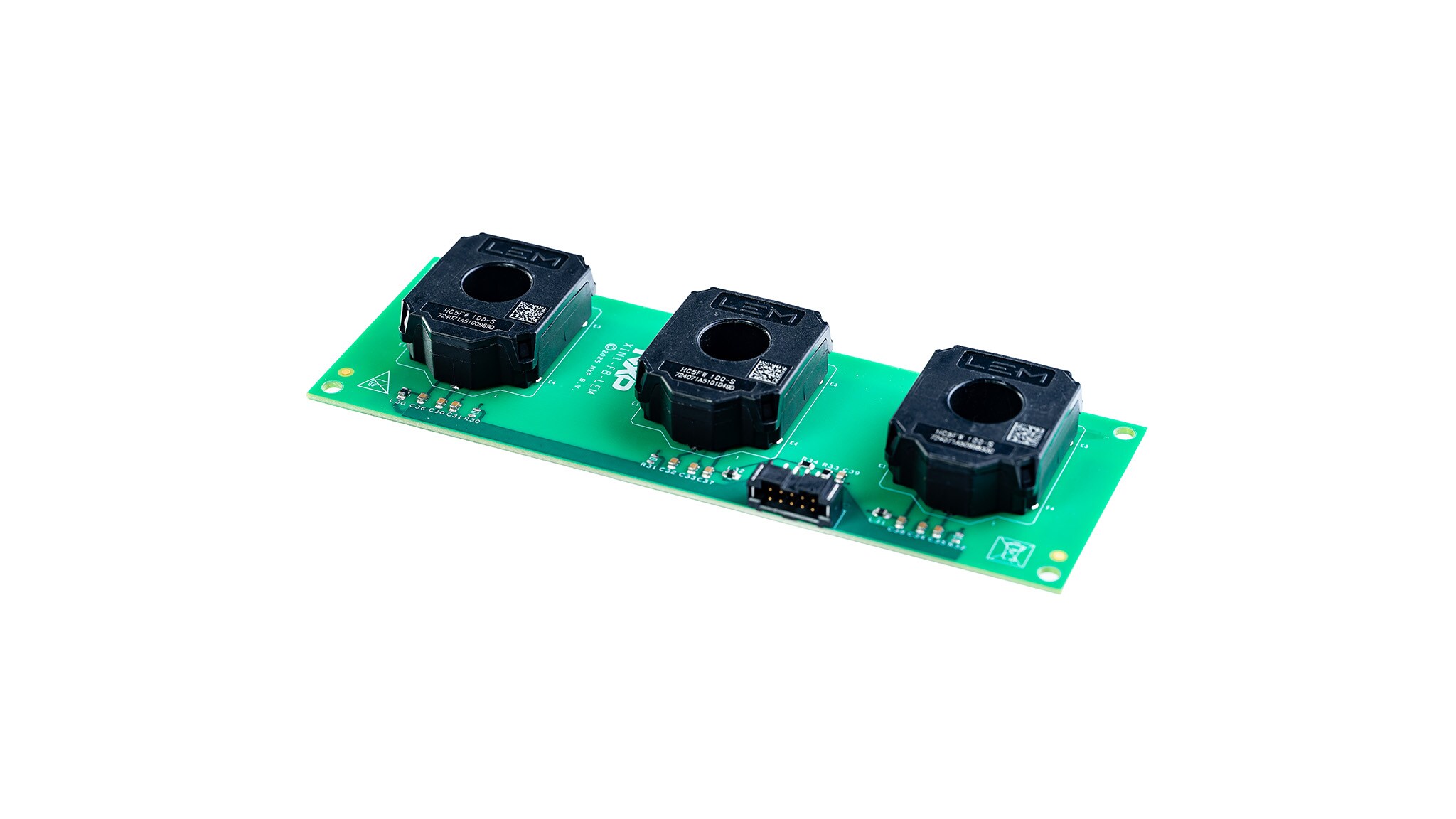 The LEM current sensing board provides accurate and reliable current measurement for automotive and industrial applications. It integrates three open-loop Hall effect current sensors supporting bidirectional current sensing up to ±100 A. The solution enables galvanically isolated current measurement, ensuring safety and robustness in high-power systems. Each channel delivers a single-ended analog output centered at 2.5 V, optimized for direct connection to standard ADC inputs, enabling seamless integration with control and monitoring systems.