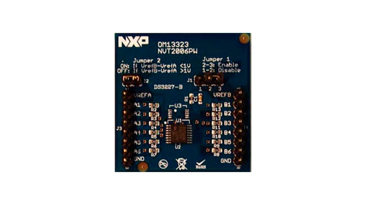 NVT2003DP (OM13319)、 NVT2004TL (OM13316)和NVT2006PW (OM13323)演示板旨在评估恩智浦3通道、4通道和6通道双向电压电平转换器。演示板连接不同电压电平下的I/O器件。由于NVT2003DP、NVT2004TL和NVT2006PW器件是无源器件,可能需要上拉电阻,具体取决于I/O接口类型(图腾柱或开漏)、转换电压差异和转换方向(高压到低压,低压到高压,或双向)。NVT2003DP、NVT2004TL和NVT2006PW器件允许在1.0 V至5.5 V的任何电压之间进行转换。