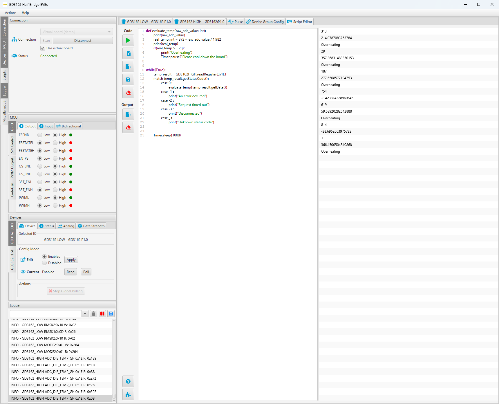 FlexGUI内置的Python 3解析器支持用户为特定场景编写定制脚本。模拟IC和MCU以单例对象形式注入环境,提供与硬件交互的API接口。此外,用户还可以充分利用Python语言的所有语句、内置函数和数据类型。