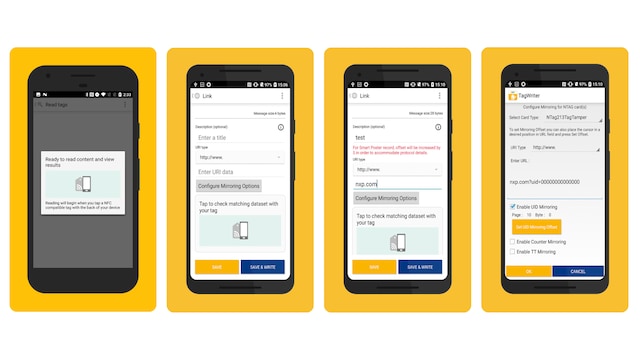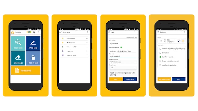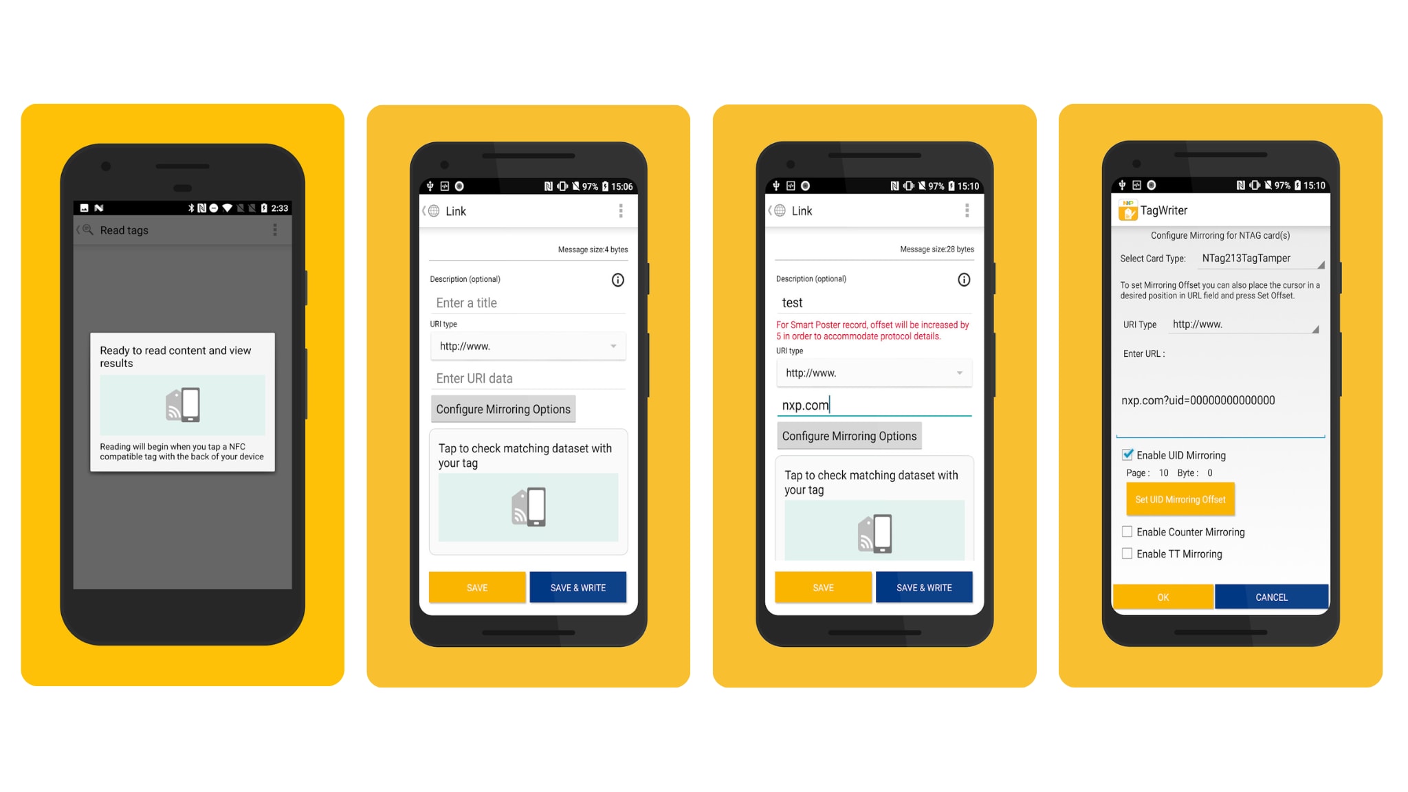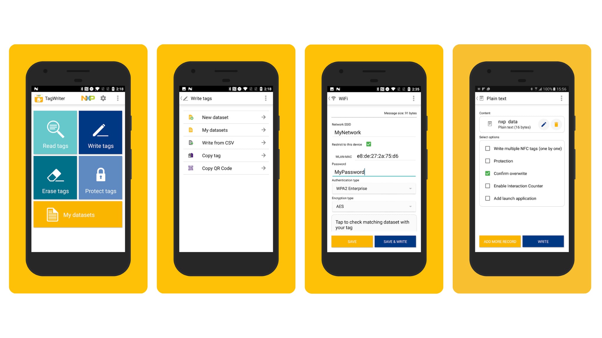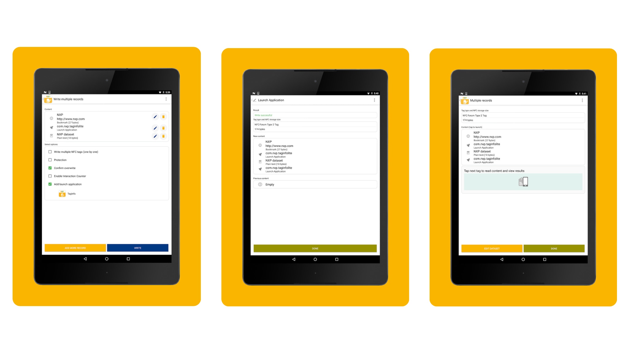 恩智浦的NFC TagWriter App允许您编写标签,使用户能够存储联系人、书签、与Wi-Fi或Bluetooth®配对,支持热点、发送文本消息等等,所有这些只需轻轻一刷就能完成。数据存储完成后,应用程序还可读取和查看已编程的数据,包括根据存储数据自动启动应用程序的选项。