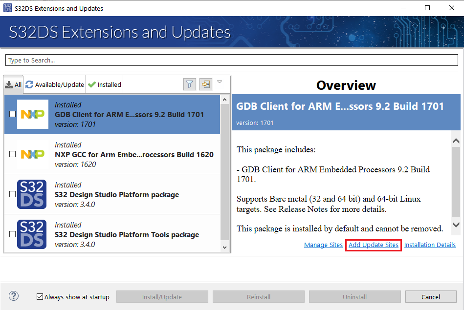 1. 在菜单栏选择Help → S32DS Extensions and Updates (帮助→ S32DS扩展与更新),选择Add Update Sites (添加更新站点)
