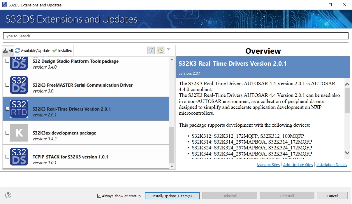 此外,S32 Design Studio for S32 Platform v.3.4 Update 3 with support for S32K3 devices包必须安装在S32 Design Studio for S32 Platform v.3.4 with support for S32K3 devices的上面。