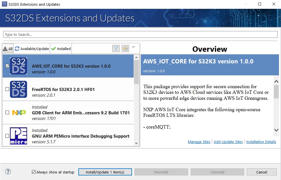 • 选择AWS_IOT_CORE for S32K3 1.0.0版并安装(其余的依赖项将默认安装)
