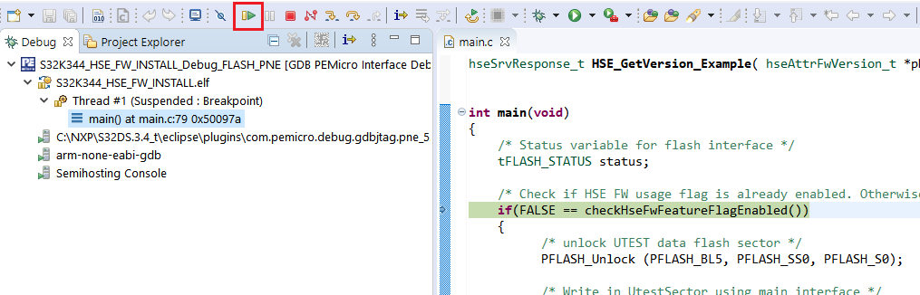 当按照“运行演示”部分的指示运行项目时,可以使用S32 Design Studio中内置的调试器(例如,您可以在点击“继续”之前设置断点,或者暂停执行并检查当前执行的代码)。有关调试的详细信息,请参见《S32DS用户指南》(“调试”章节),该指南位于S32 Design Studio安装中: