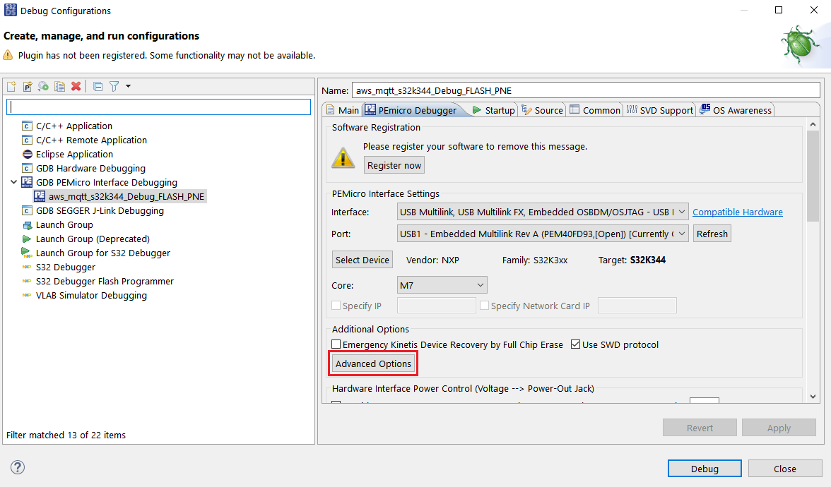 点击S32 DS中的“调试”按钮对应的向下箭头,然后选择“调试配置” 选择aws_mqtt_s32k344_Debug_FLASH_PNE,点击“调试”按钮。