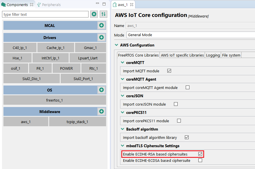 aws组件允许您配置mbedTLS的密码套件设置。如果默认情况下从IoT Console生成设备证书和私钥,它们将基于RSA,因此必须相应地更新密码套件: