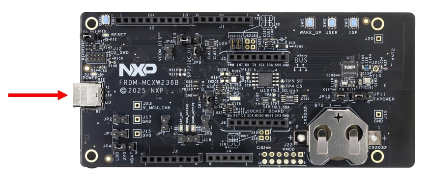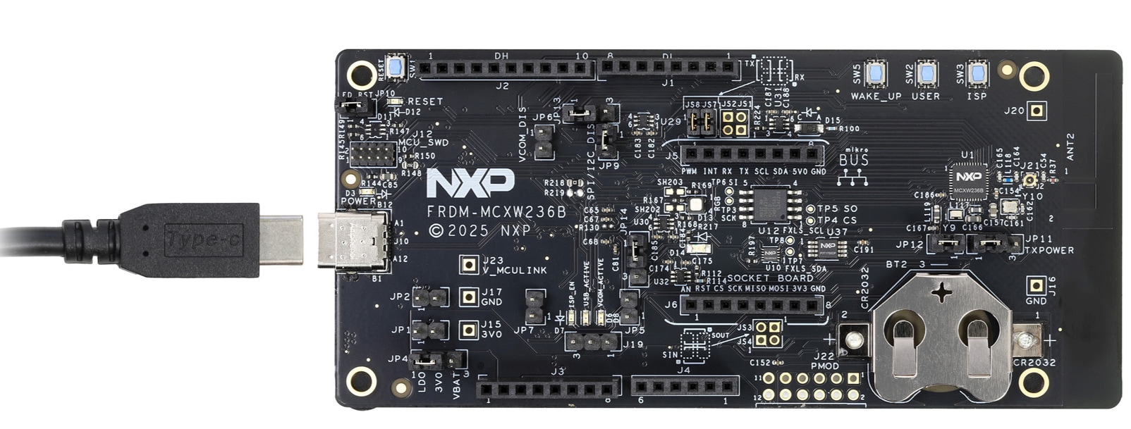 SDK_2_16_000_FRDM-MCXW71.zip)本实验针对恩智浦MCX W评估套件(FRDM)。该套件提供丰富的连接外设,帮助用户评估设备。它还包括一个板载硬件调试器。该硬件调试器已预编程了CMSIS-DAP固件,供本实验使用。为了在示例中显示调试消息,实验室通过同一硬件调试器连接到通信端口。