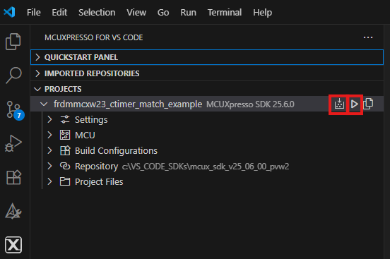 driver_examples/ctimer/ctimer_match_example,点击与该文本匹配的行以进行选择。然后点击“导入” frdmmcxw23_ctimer_match_interrupt_example项目,编译并运行该示例,具体操作请参考前一节的说明