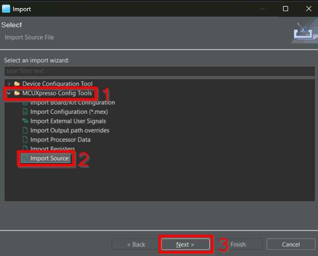 将弹出一个新窗口,在导入窗口中点击“MCUXpresso配置工具”选项卡将其展开,然后点击“导入源”按钮,接着点击“下一步”。