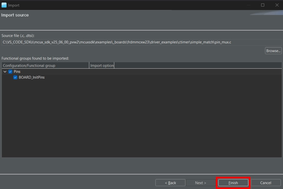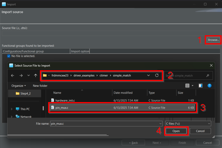 然后点击“浏览”按钮,按照步骤2中的说明搜索您的项目路径,接着选择“pin_mux.c”文件并点击“打开”。