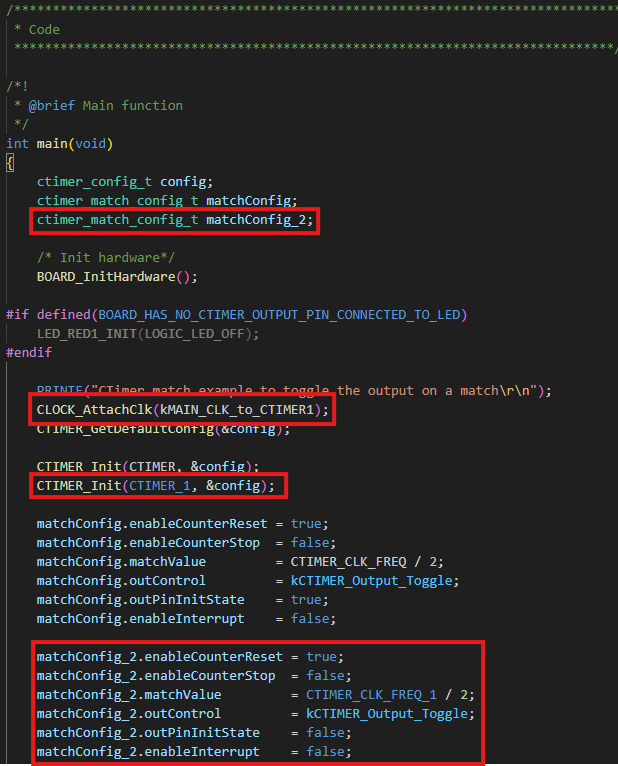 ctimer_match_config_t变量,然后为模块连接所需的时钟输入,接着将初始化计时器并开始设置匹配配置。