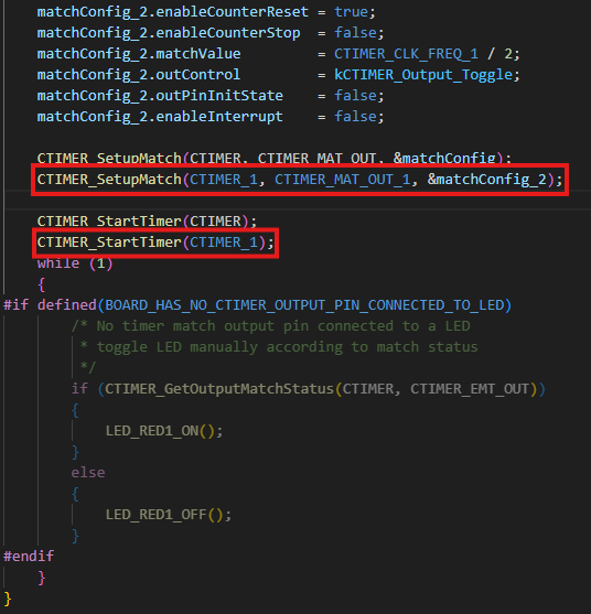 simple_match_interrupt.c文件,添加以下宏来初始化新的CTIMER,以启用蓝色LED的输出。