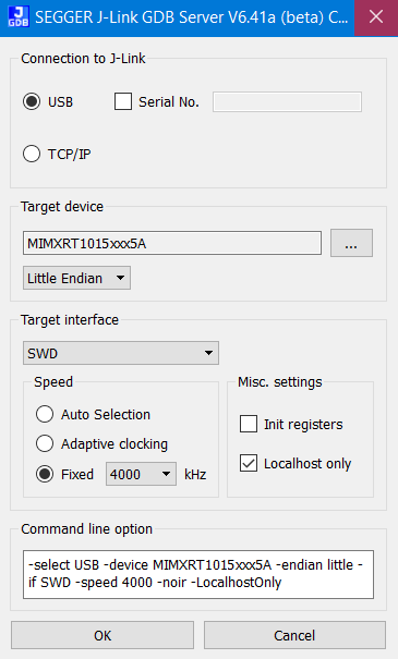 打开J-Link GDB服务器应用。访问SEGGER安装文件夹,例如:C:\Program Files (x86)\SEGGER\JLink_V632f。打开命令行窗口,使用命令"JLinkGDBServer.exe",调试并发布目标。注:对于sdram_debug和sdram_release目标,使用命令"JLinkGDBServer.exescriptfile