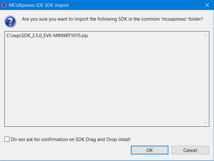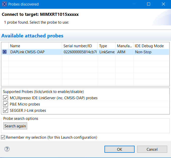 MCUXpresso IDE将探测互联的板,并应查找CMSIS-DAP硬件调试器,此硬件调试器是MIMXRT1010-EVK上OpenSDA集成电路的一部分。点击OK (确定)继续。