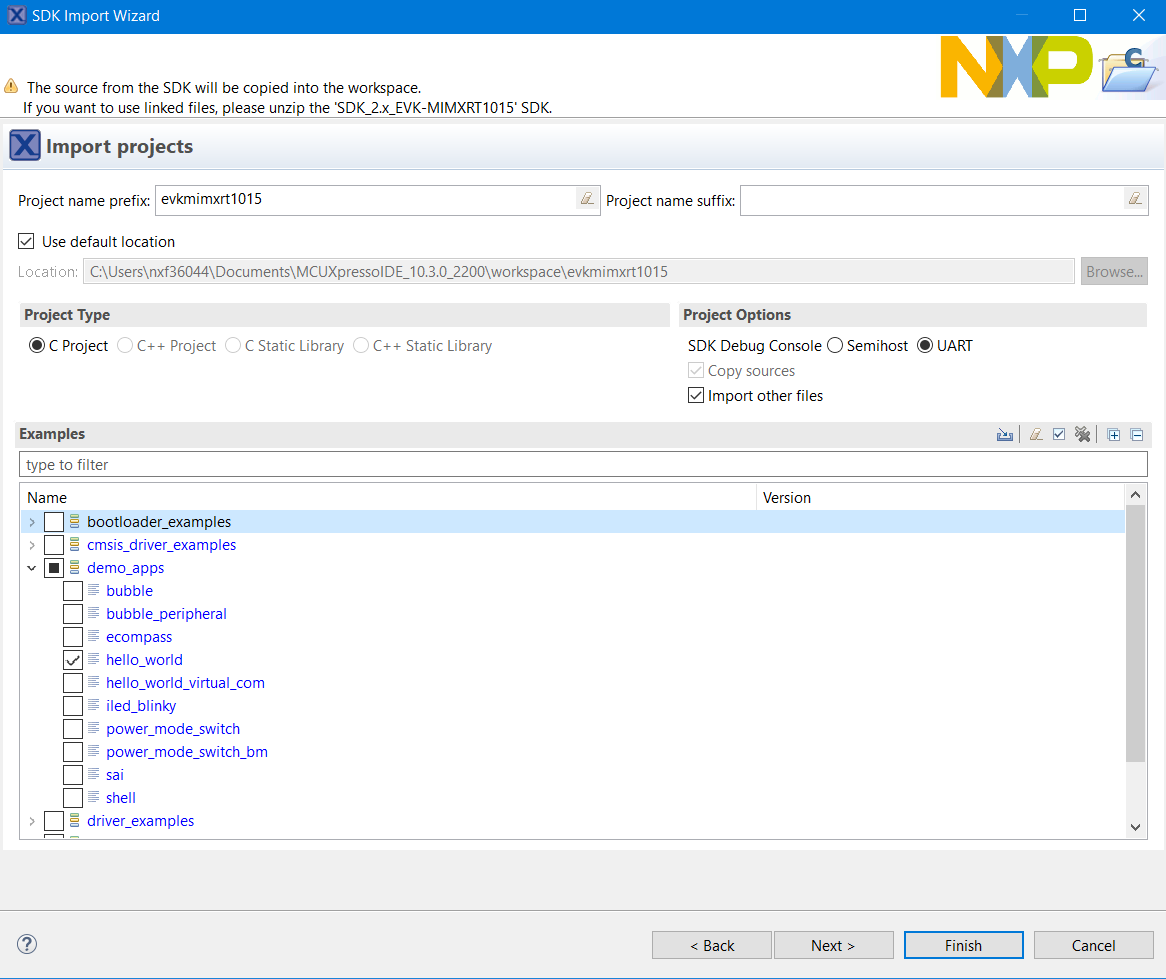 使用箭头按钮来展开demo_apps类别,然后点击hello_world旁边的复选框来选择该项目。确保选择UART作为SDK调试控制台。然后点击Finish。