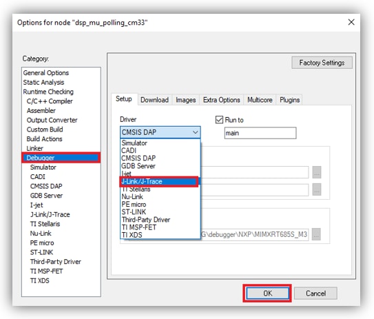 Note: In case of building errors, make sure that the correct Board is selected, right-click in the project → Options → General Options → Target → Device, Select the NXP IMXRT685S_M33, this board is supported in IAR Embedded Workbench for Arm version 8.40.1 or Higher.