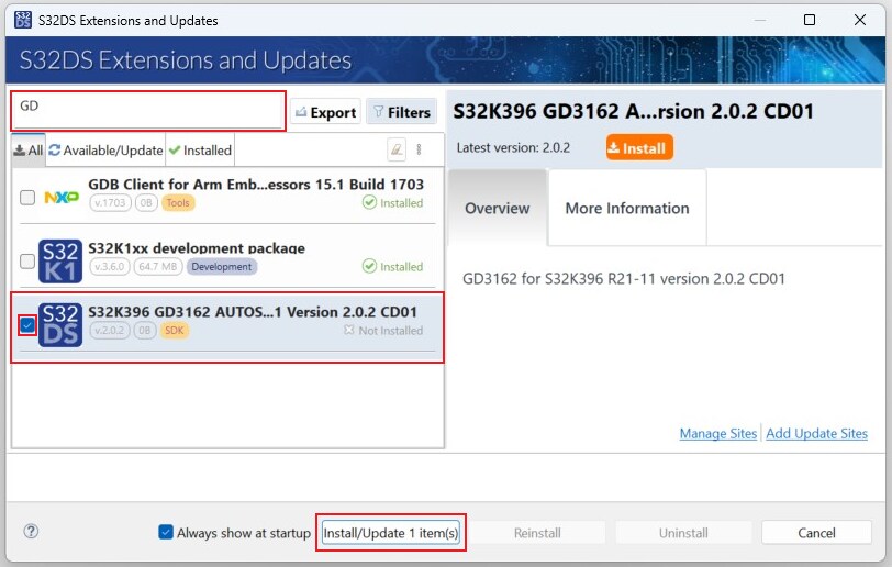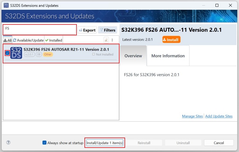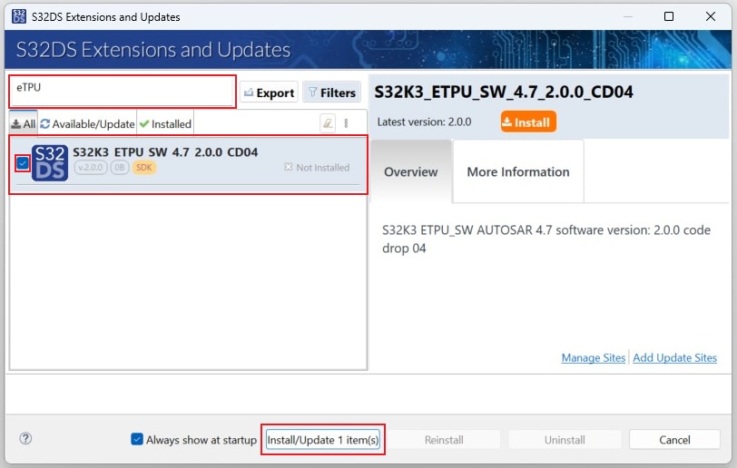 在S32DS中,从顶部菜单转到Help→S32DS Extensions and Updates(帮助→S32DS扩展和更新),打开“S32DS扩展和更新”对话框。