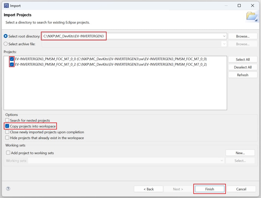 NXP\MC_DevKits\EV-INVERTERGEN3,点击“选择文件夹”。接下来,选中Copy projects into workspace(将项目复制到工作区)选项框。然后,点击“完成”
