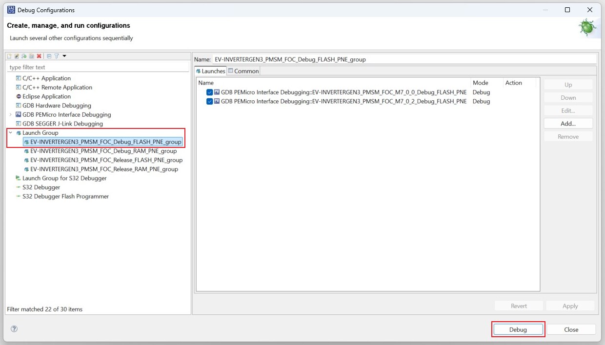 接下来,展开“启动组”并点击第一个启动配置。该配置将把M7_0_0和M7_0_2项目上传到MCU。点击“调试”,构建软件并将其上传到MCU中。