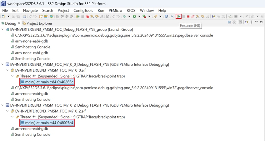 S32DS将切换到“调试”视图。首先,按住Ctrl键并点击两个项目main()文件以突出显示它们。接下来,通过点击“继续”(或按F8)让这两个项目都运行。
