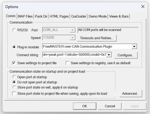 注:可点击Project → Options(项目→选项)来查看或修改通信设置。