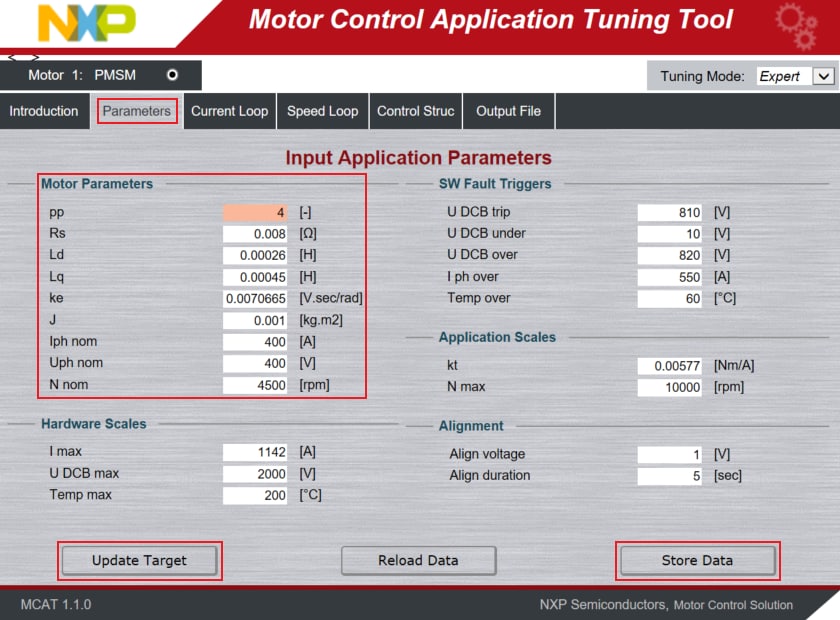如未使用Vepco电机,可能需要根据使用的PMSM电机编辑电机参数。在电机控制应用调优(MCAT)工具中,切换到“参数”选项卡并在左侧编辑值。