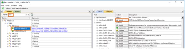 安装MDK工具后,必须安装Keil设备包,才能从调试方面完全支持设备。这些设备包内含存储器映射信息、寄存器定义和闪存编程算法。按照这些步骤安装相应的CMSIS包。