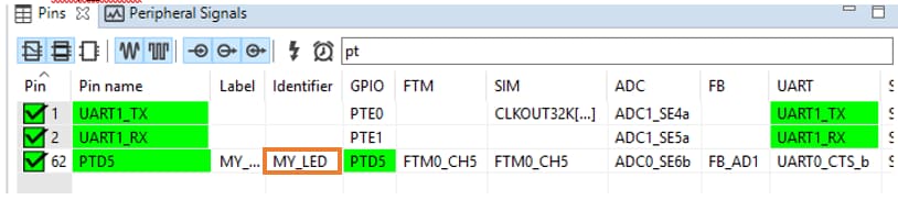 PTD5已经为led_output示例配置的FRDM-K22F设置了一个定义的标识符(即LED_BLUE)。在引脚表中的PTD5旁,将标识符更改为“My_LED”